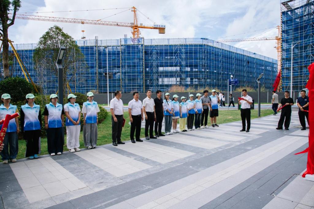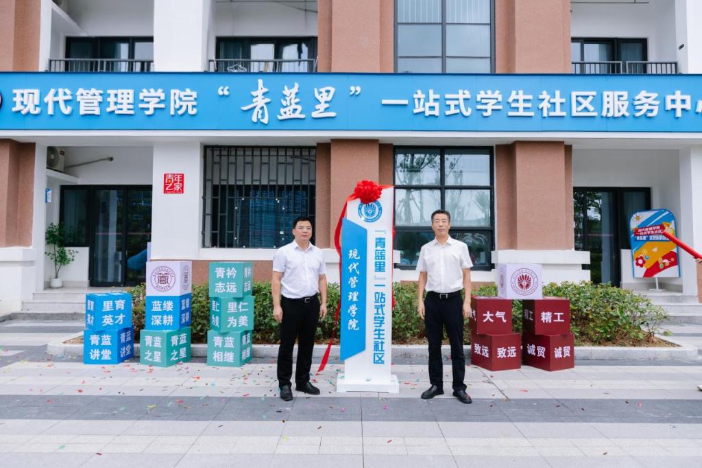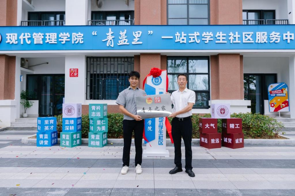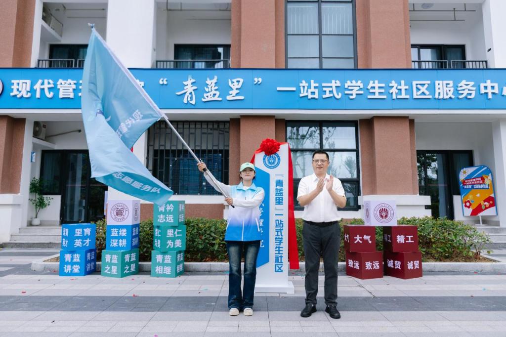 仪式上,张志东与王春柳共同为“青蓝里”一站式学生社区揭牌,标志着社区正式启用。随后,王春柳为“青年之家”授牌,现代管理学院团总支书记鲁金金接牌;蔡景界为“青小蓝”志愿服务队授旗,由学生志愿队队长接旗。三项议程依序推进,现场气氛庄重热烈。