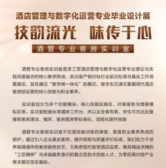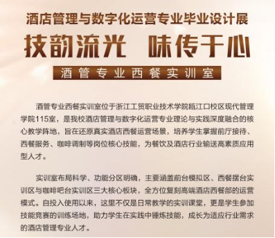 2025年12月31日至2026年1月5日,酒店管理与数字化运营专业毕业设计展在瓯江口校区实训中心成功举办。本次展览以“技韵流光·味传于心”为主题,融合专业技艺与人文美学,集中呈现了2026届毕业生在中餐摆台、西餐摆台、客房夜床等方向上的创意成果。