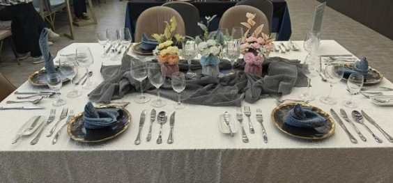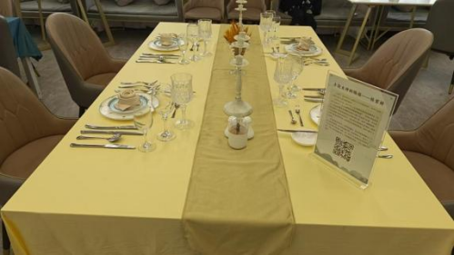 毕业生们在作品中深度结合餐饮服务规范与个性化美学表达,通过色彩叙事、材质对比与文化符号的巧妙运用,在遵循中西餐摆台礼仪的基础上,融入青花、生态、神话、禅意等多元意象。每件作品既体现专业技艺的严谨,也承载情感表达与价值思考,展现了从技能实践到美学创造、从文化理解到行业关怀的综合设计能力。