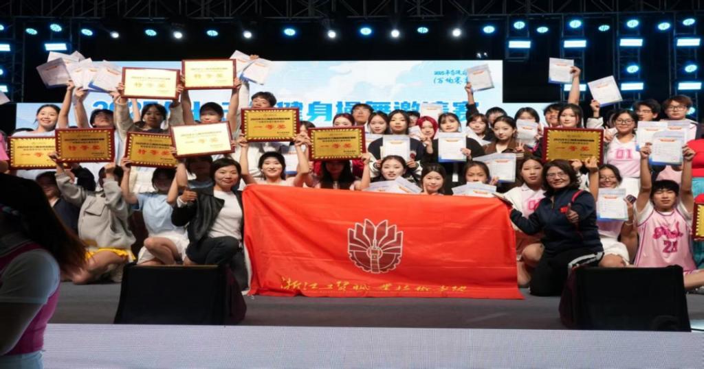 2025年长三角健身操舞邀请赛于10月26日在乐清体育馆举办。据悉,此次比赛共有31支队伍800多人参加。浙工贸操舞队学生在领队现代管理学院副院长朱秀清、教练郭秀清的带领下,共派出5支队伍60名学生参加9个青年组项目。他们凭借着熟练的技艺、饱满的热情和富有感染力的舞台表现,在众多参赛队伍中脱颖而出,一举斩获四个特等奖、五个一等奖的优异成绩。