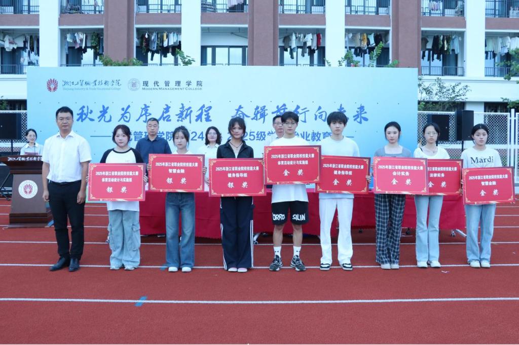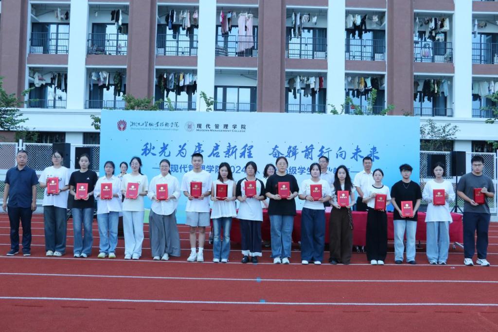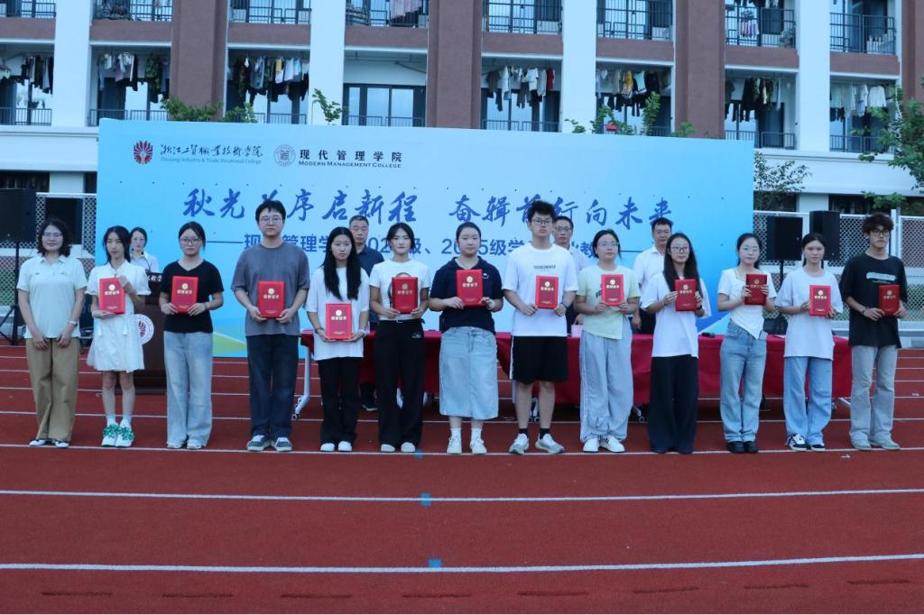 在颁奖环节,学院重点表彰了在2025年浙江省及世界职业院校技能大赛中获奖的团队与个人,以及暑期社会实践优秀队员。一张张荣誉证书、一次次热烈掌声,既是学子们拼搏奋斗的勋章,更彰显了现代管理学院“实践育人”的成效,为全体师生树立了“崇尚技能、勇于实践、担当有为”的榜样标杆,更激励着全院学子以先进为范,在成长道路上勇攀高峰、再创佳绩。