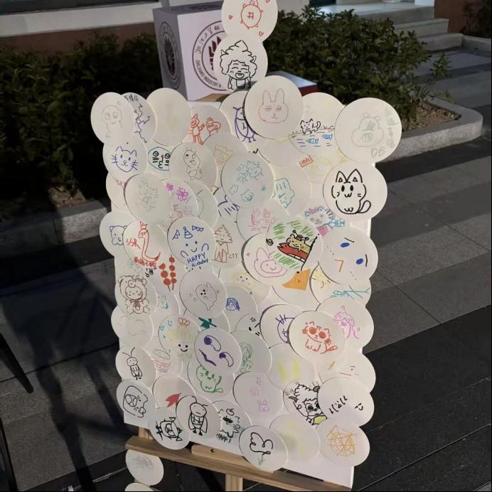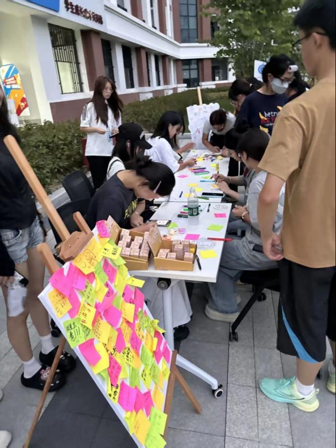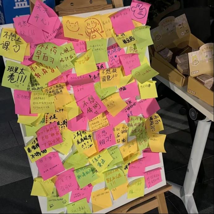活动现场设置了“心情盲盒站”“情绪涂鸦板”和“正向能量场”三大特色互动区域,吸引了众多同学参与。在“心情盲盒站”,同学们将近期的烦恼与快乐匿名写在彩色卡片上,投入“焦虑回收站”与“快乐储蓄罐”,再随机抽取他人卡片手写暖心回复,在匿名交流中完成了双向治愈。“情绪涂鸦板”前,大家用五彩画笔和情绪贴纸自由创作,以色彩与图案直观表达内心感受,将无形情绪化为生动画面。“正向能量场”则提供了解压玩具DIY材料,同学们动手制作捏捏乐、黏土作品舒缓压力,同时通过盲抽励志书签获取精神鼓励,现场气氛轻松愉悦。