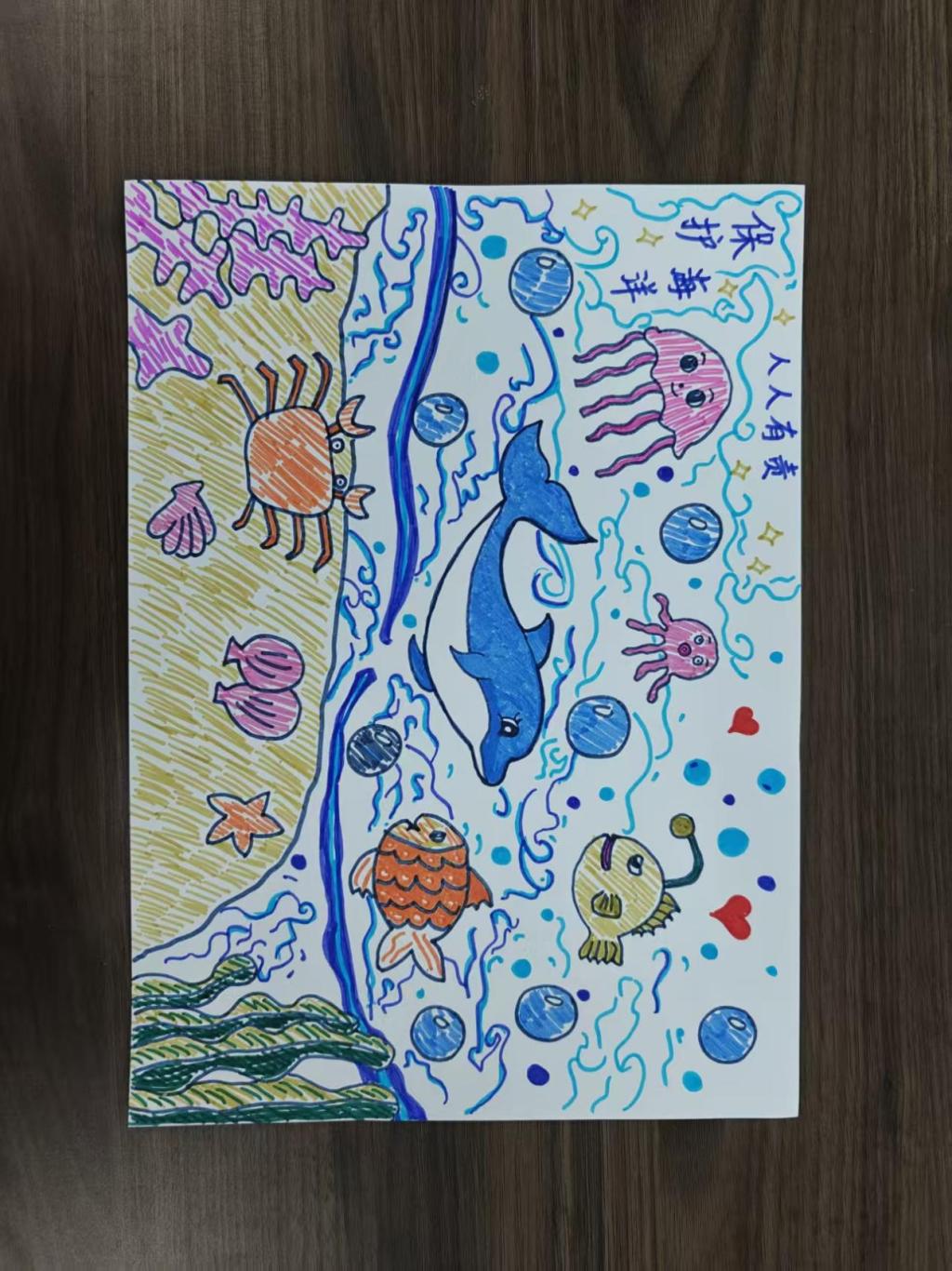 活动期间,现场组织有序,参与同学态度积极。主持人首先结合100年来全球58场海啸致26万余人遇难的历史数据,系统阐释世界海啸日的设立背景与核心意义,引导师生深刻认识防灾减灾与海洋保护的重要性和紧迫性。创作环节中,参与同学使用现场统一提供的A4纸及颜料笔,全身心投入作品创作:部分作品通过呈现海洋生态原貌,传递生态保护的重要性;部分作品融入海啸预警标识、防灾防护场景等关键元素,强化灾害防范知识的可视化传播。