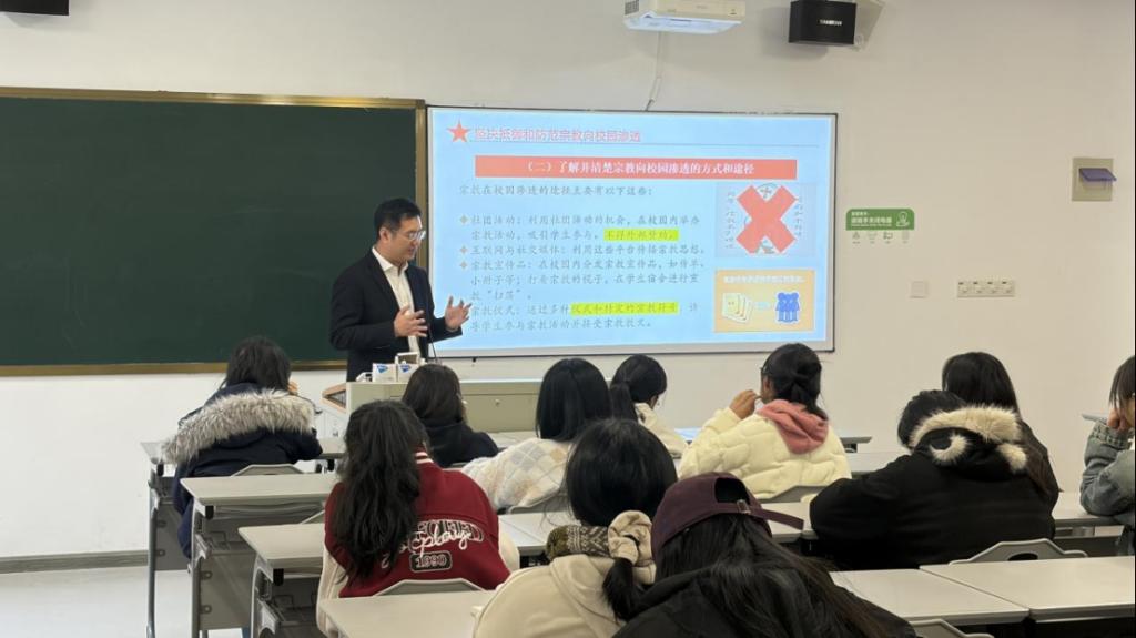在马克思主义宗教观专题分享环节,邵超群书记从马克思主义关于宗教的基本观点出发,结合我国现行宗教政策与校园实际情况,精准厘清了“宗教信仰自由”与“校园宗教活动规范”的核心界限。他着重强调,入党积极分子作为青年群体中的先进骨干,要牢牢坚定辩证唯物主义立场,自觉抵御极端宗教思想渗透,主动在校园中承担起马克思主义宗教观的传播与践行责任,以实际行动守护校园思想阵地。